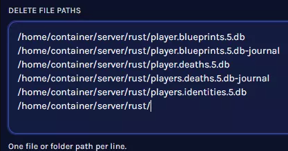 /home/container/server/rust/player.blueprints.5.db/home/container/server/rust/player.blueprints.5.db-journal/home/container/server/rust/player.deaths.5.db/home/container/server/rust/players.deaths.5.db-journal/home/container/server/rust/players.identities.5.db/home/container/server/rust/